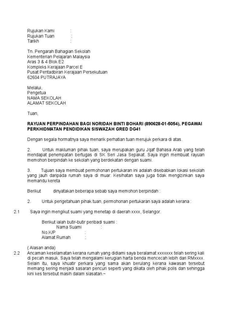 Contoh Surat Rayuan Pertukaran Guru. Nama ketua sektor Ketua Sektor Pengurusan Sekolah negeri. Contoh Surat Rayuan Pertukaran Tempat Kerja Jururawat Selangor B.