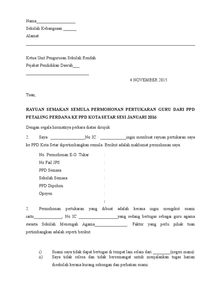 Surat Rayuan Pertukaran Guru Pdf