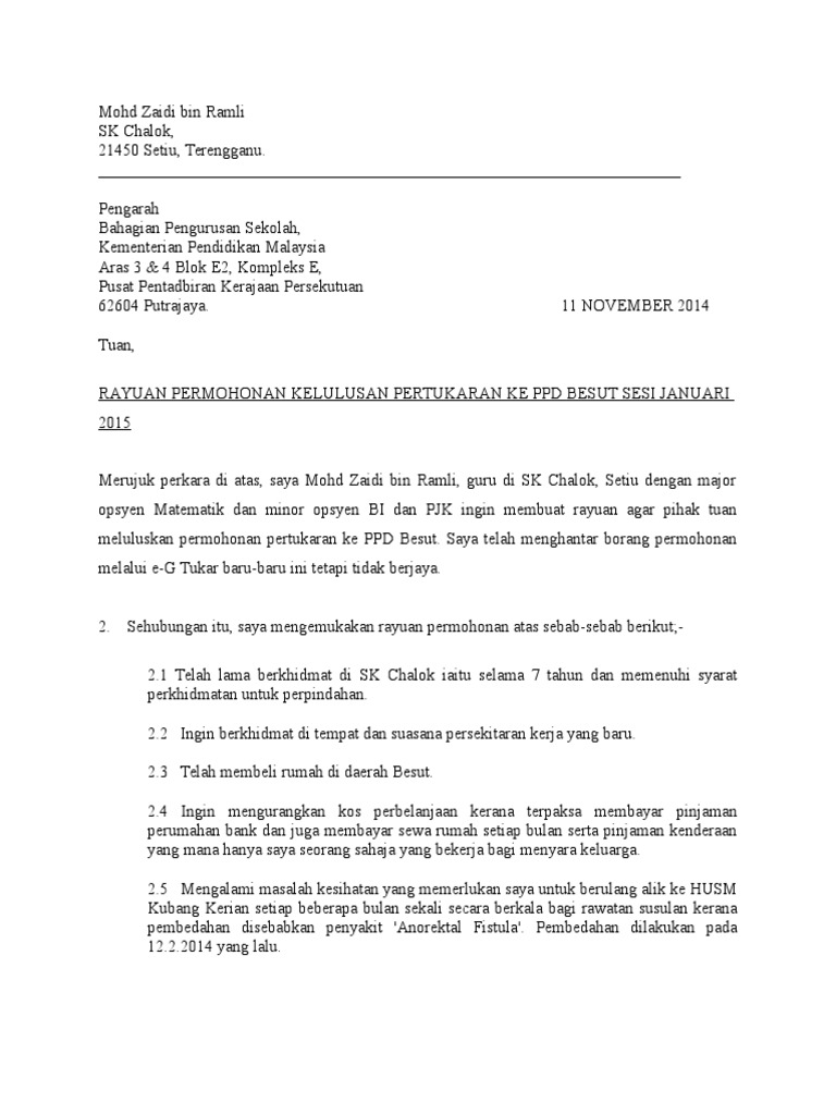 Free Pdf Download Contoh Surat Rayuan Eg Tukar Zuebir Othman Academia Edu