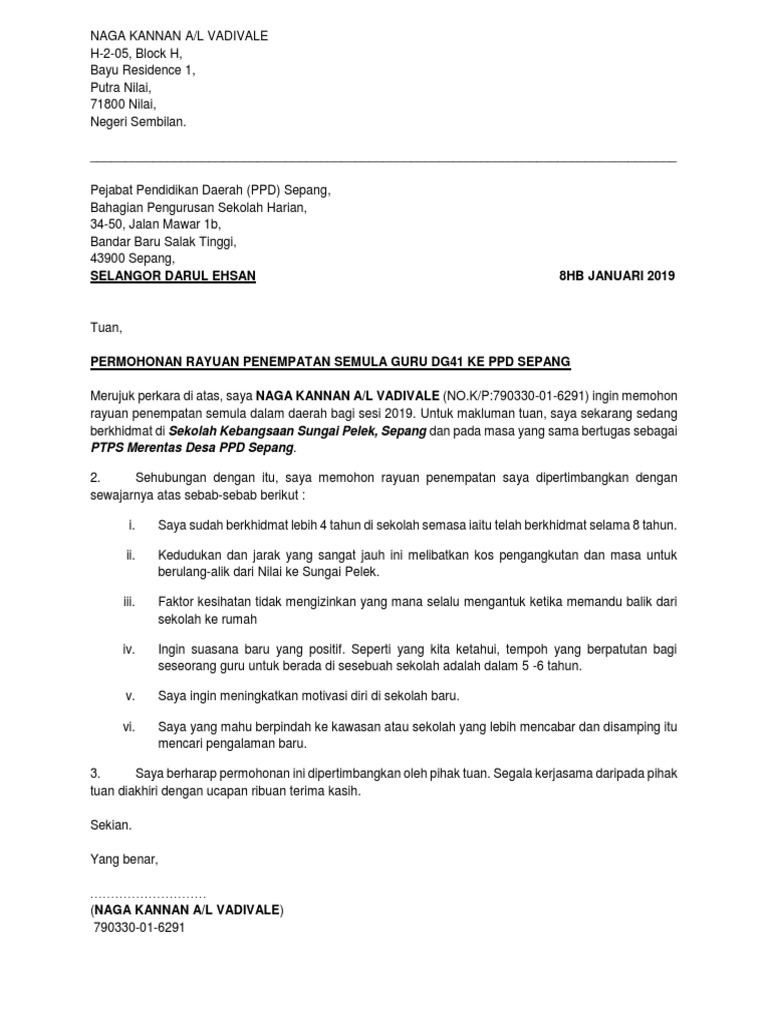Contoh Surat Permohonan Rayuan Eg Tukar Guru